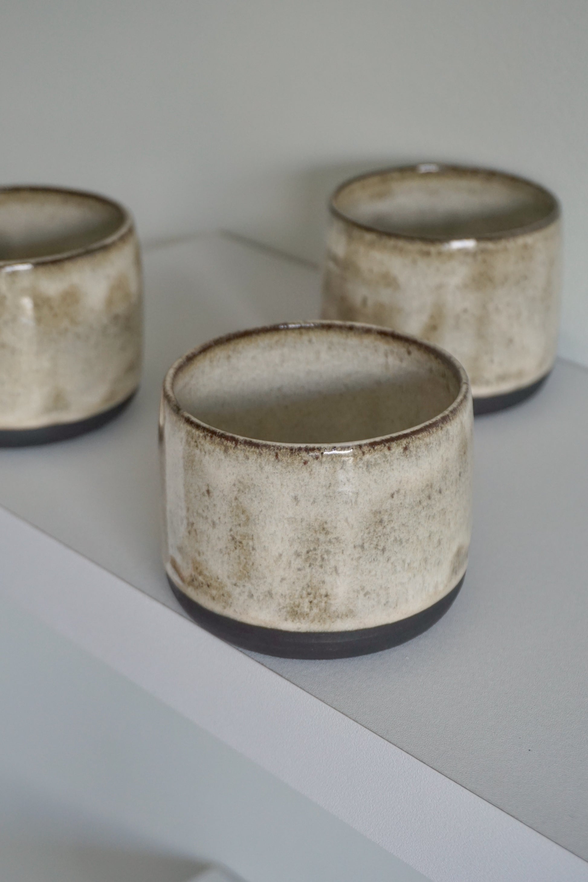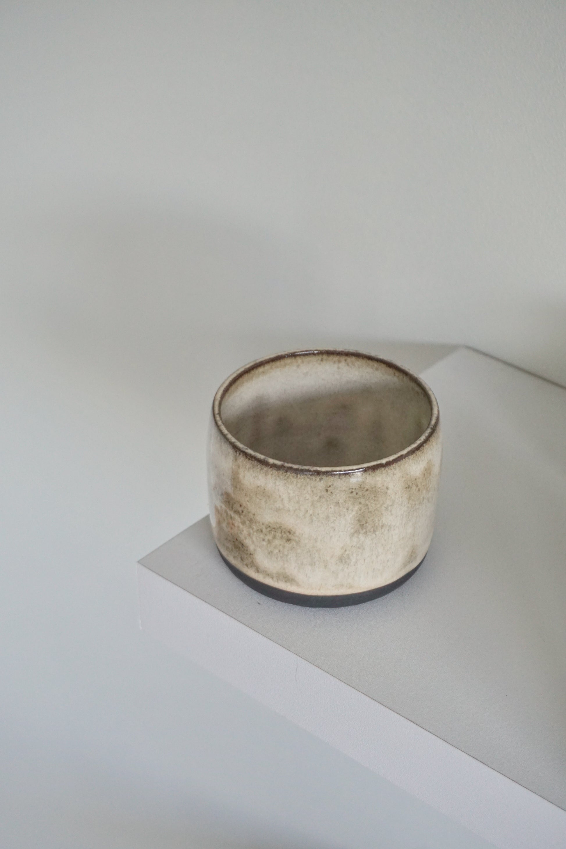 Juodo molio žiestas puodelis padengtas šviesia, efektine glazūra.