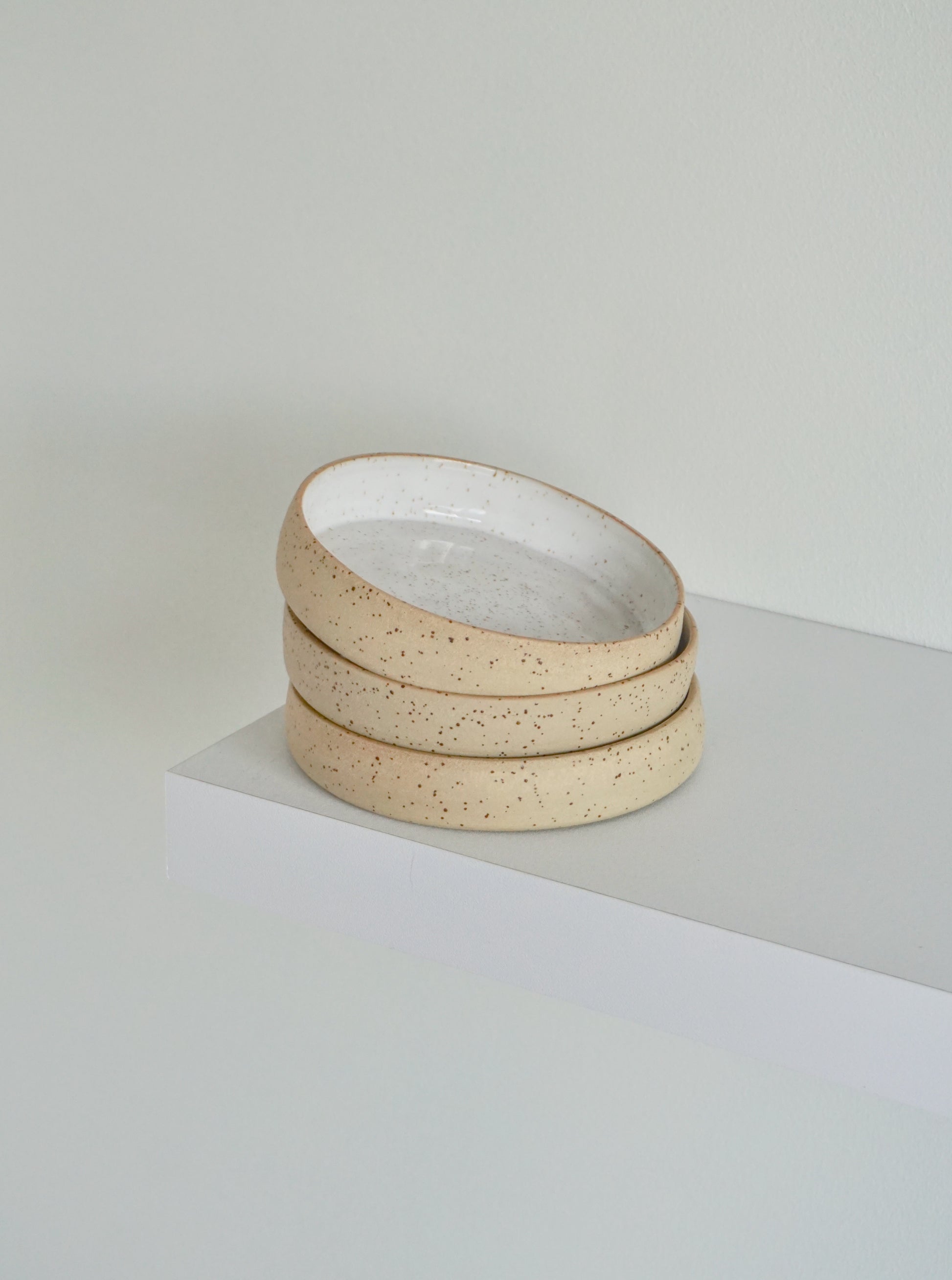 Rankų darbo žiesta lėkštelė. Išorė palikta natūrali – neglazūruota, o vidus padengtas balta glazūra.